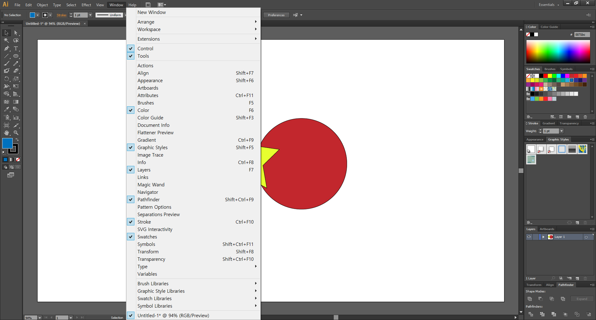 오른쪽에 패스파인더 Pathfinder가 없다면 상단 메뉴의 윈도우 Window를 클릭한 후에