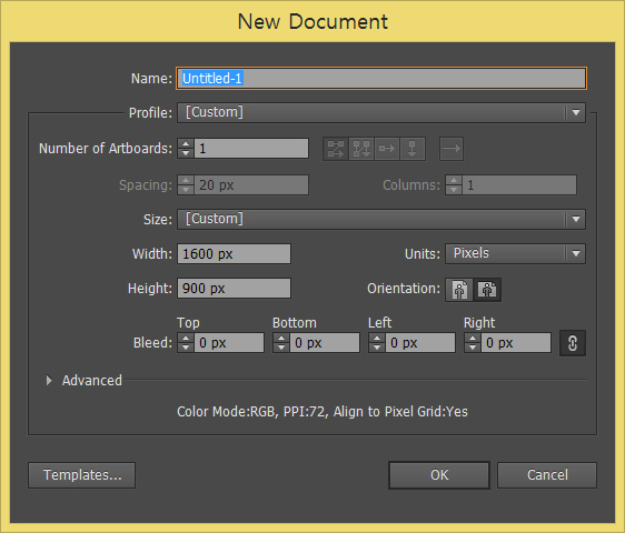 가로×세로, 1600×900의 아트보드를 만들어줍니다.