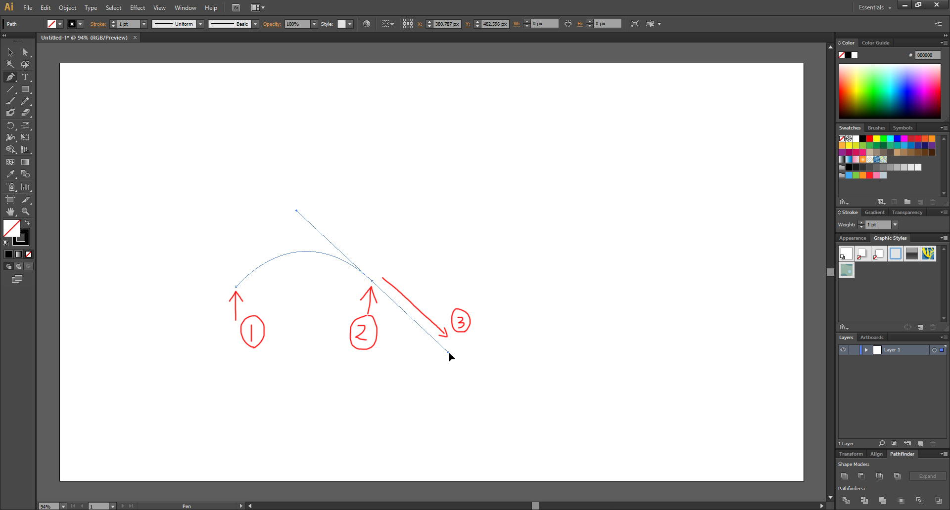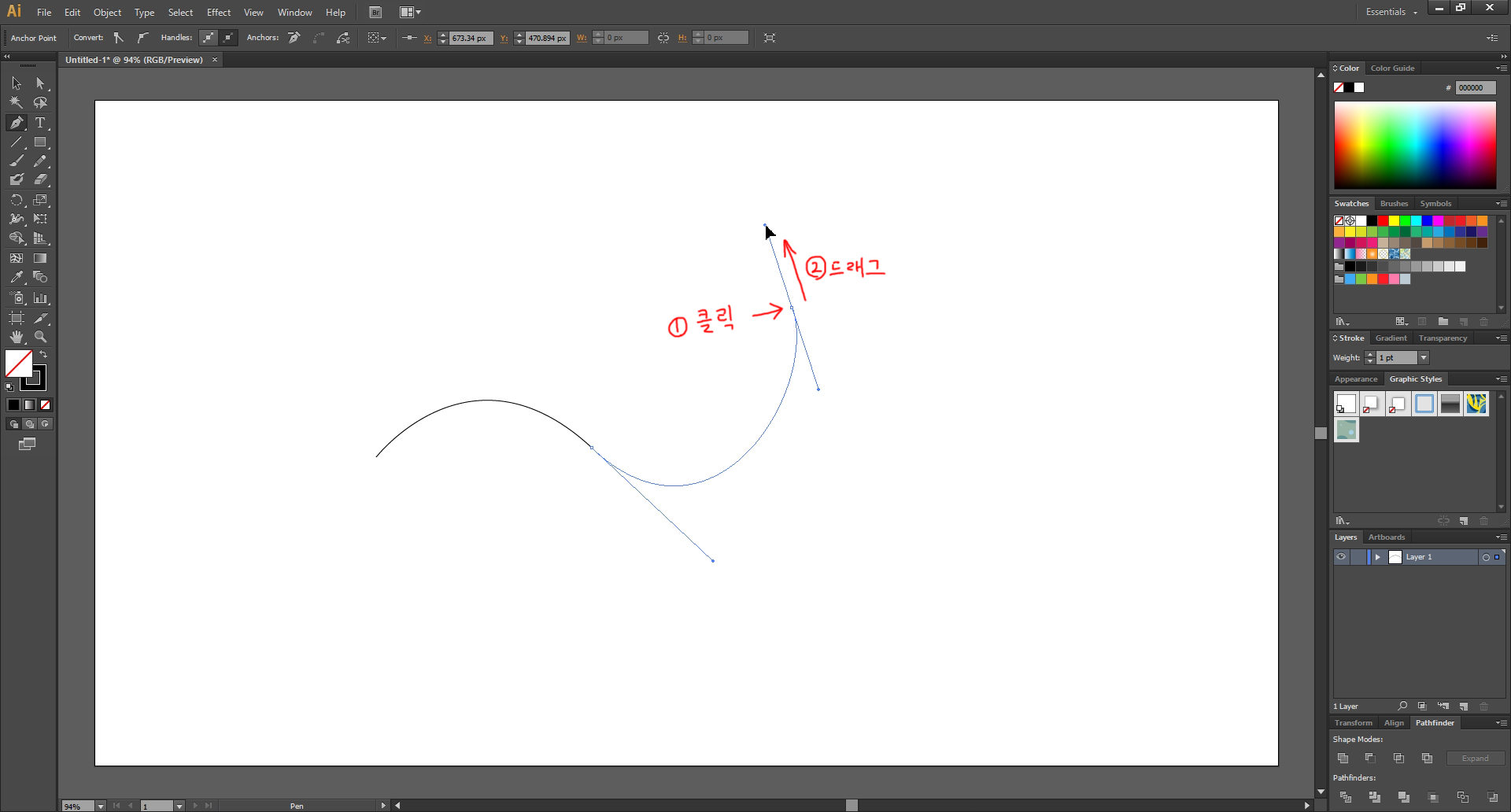 또다시 ①을 클릭한 채로 ②의 방향으로 드래그를 하면 곡선이 이어집니다.