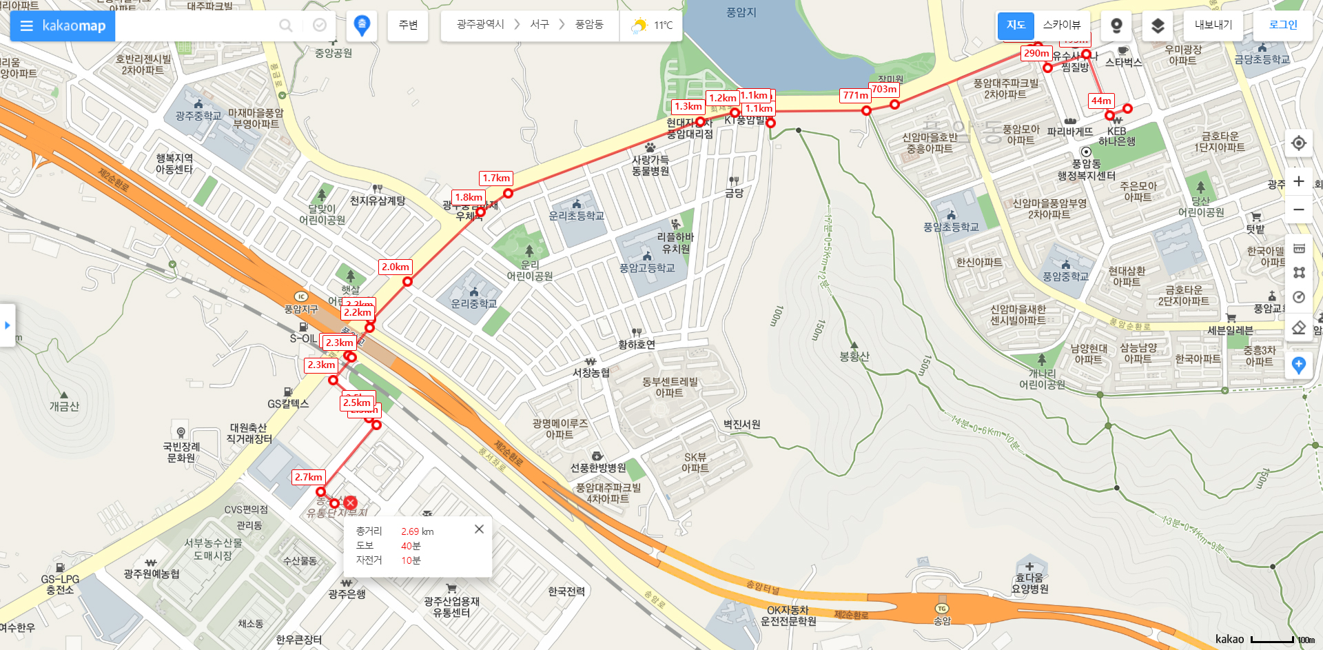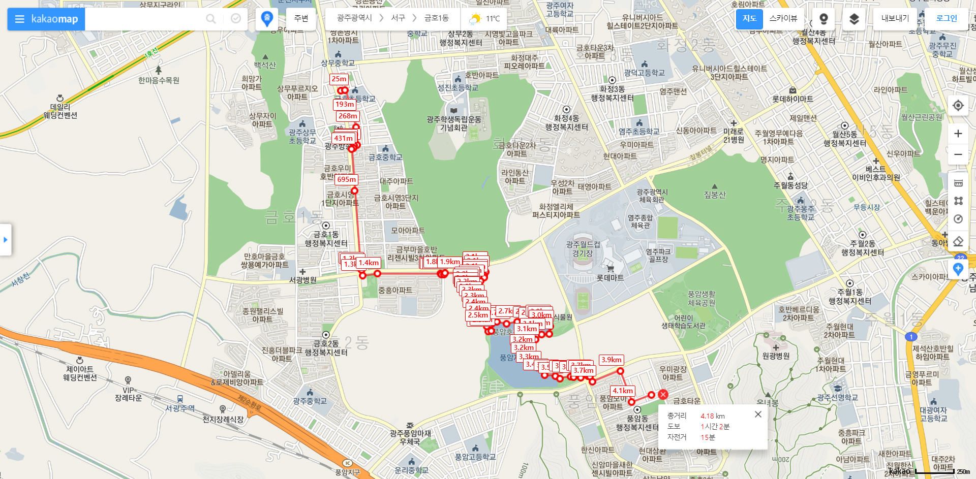 금호지구에서 풍암지구까지 또 걸어서 이동했습니다.