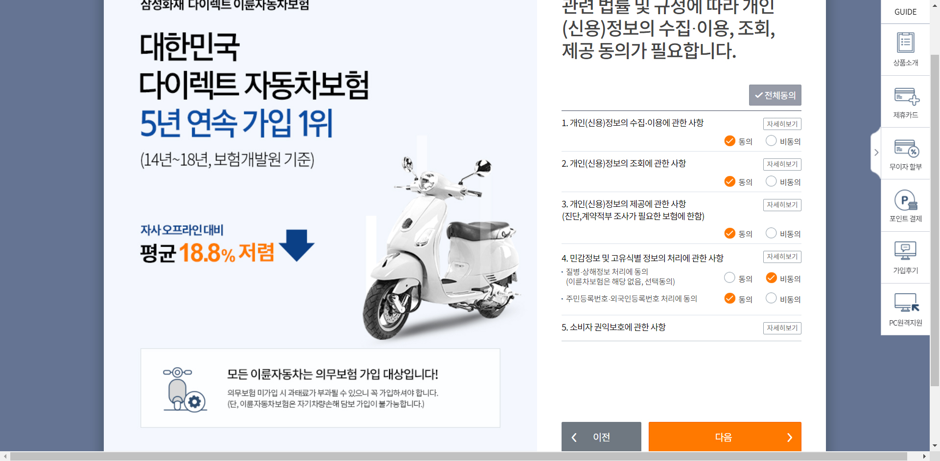 저는 이륜차보험을 해당 없다고 써있는 곳은 그냥 비동의로 했습니다.