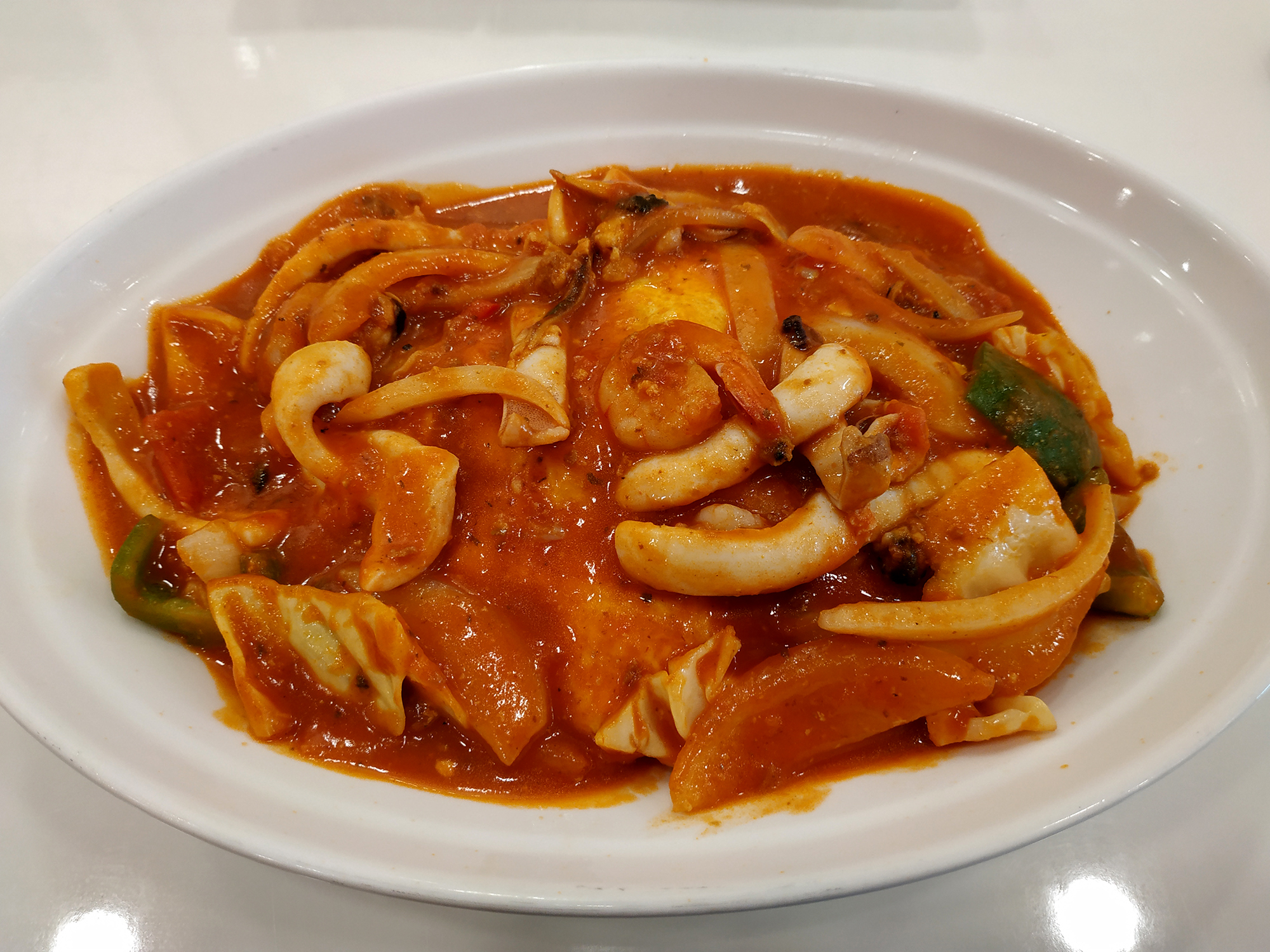 그 위로 토마토소스와 각종 야채와 해산물이 올라와있습니다.