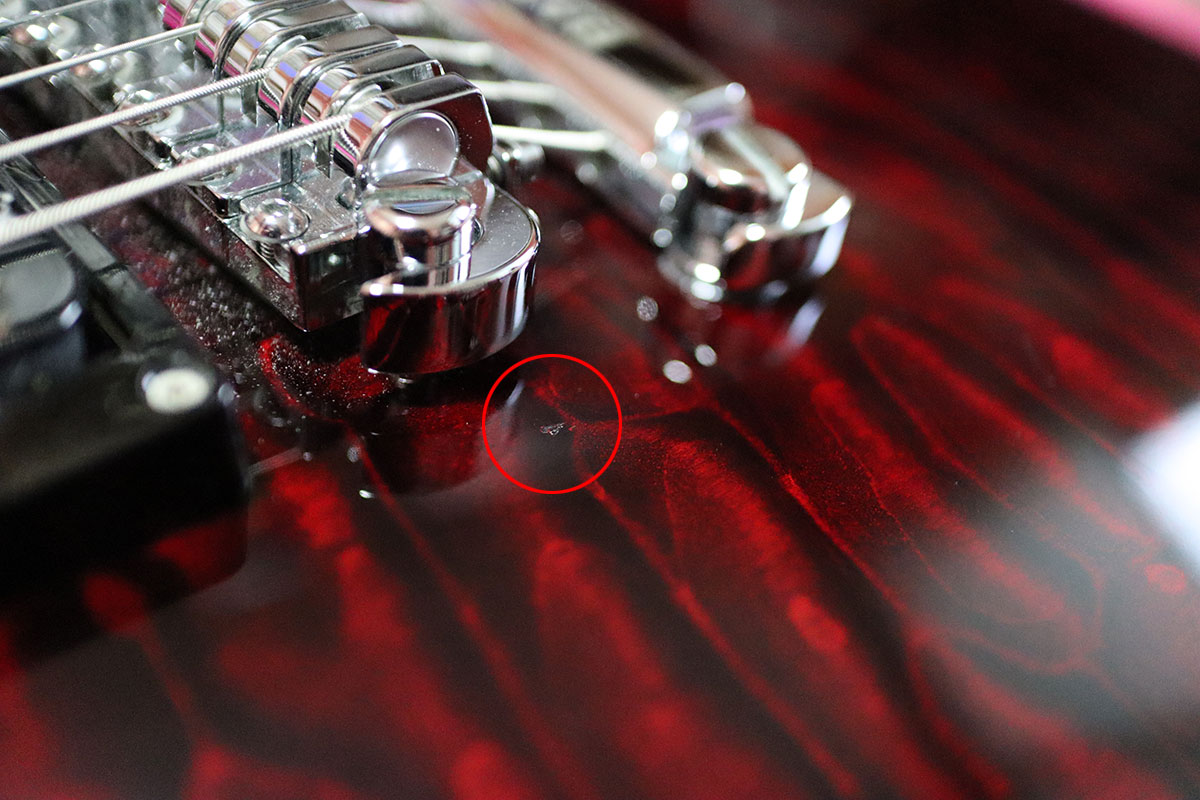 기타 바디의 브릿지 근처가 뭔가 뾰족한 것에 찍혀서 움푹 파인 자국이 생겨나 있었던 것이었습니다.