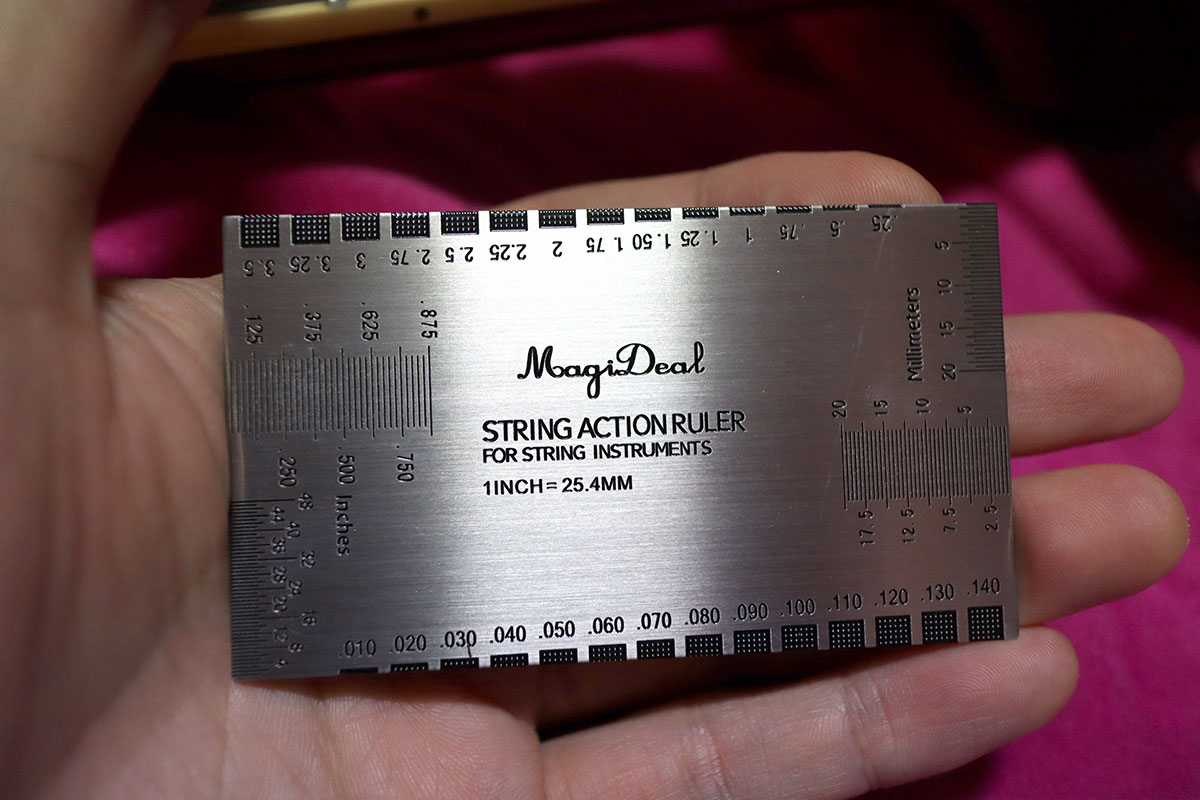 프렛과 줄의 간격이 0.17mm~0.2mm 사이면 딱 좋은 상태이지만, 그것보다 줄이 더 떠있으면 넥이 휜 것이고, 반대로 줄과 7프렛에 간격이 전혀 없이 딱 붙어있으면 반대 방향으로 휜 것입니다.