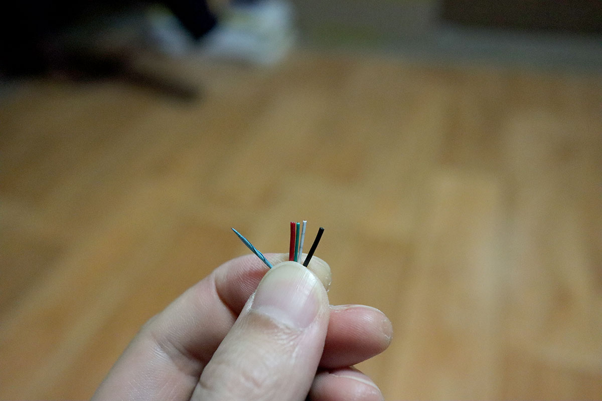 저는 제 핸드폰을 충전하던 마이크로 5핀 케이블이 두툼해서, 잘라보면 안에 선이 (접지선 포함해서) 5가닥이 있지 않을까 해서 이 케이블을 택했는데.. 결과적으로 저의 경우에는 접지선을 제외한 4가닥만 들어있었습니다.