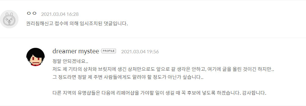 악기・기타 리페어샵에 대한 나의 후기 글이 신고를 당했다.
