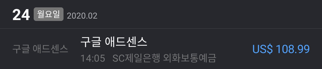 2020년 2월, 구글 애드센스에서 처음으로 돈이 들어왔을 때입니다.