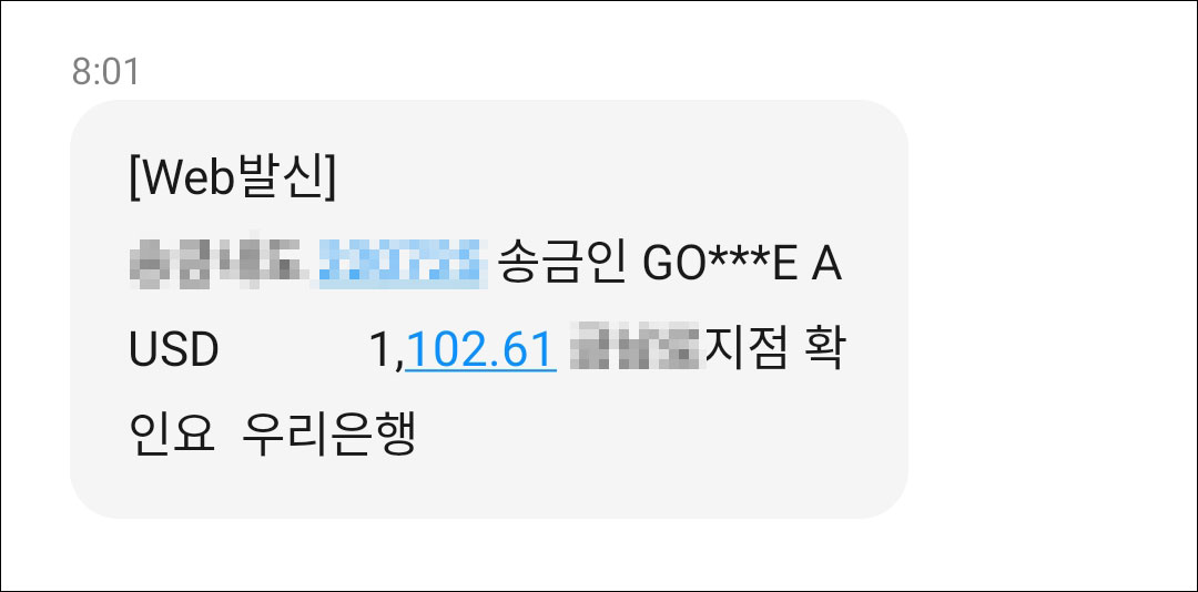 1,102.61 달러가 들어왔다고 합니다. 정확하게 5달러가 차감되어 있습니다.