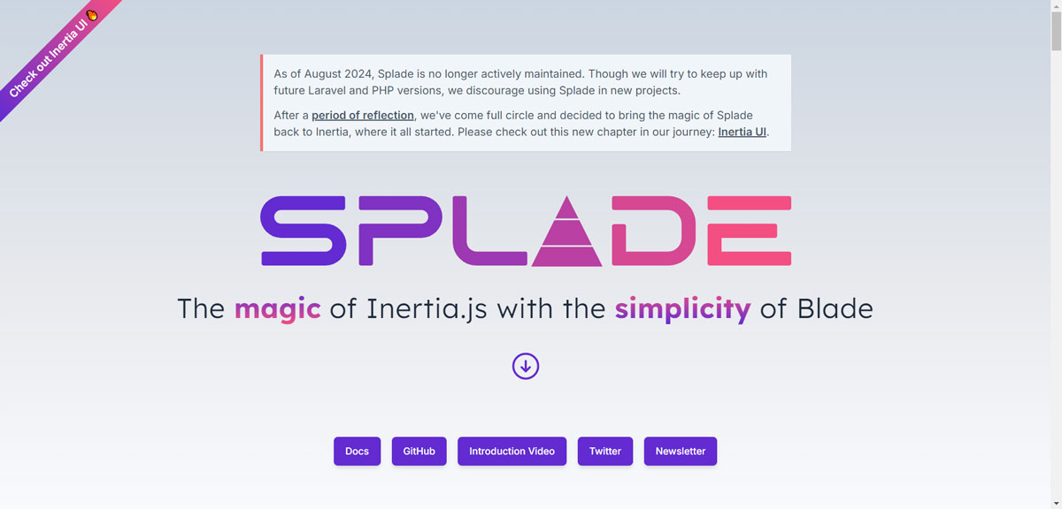 개발팀은 Splade의 기능을 Inertia UI로 옮기기로 결정했으며, Inertia UI를 사용할 것을 권장한다.