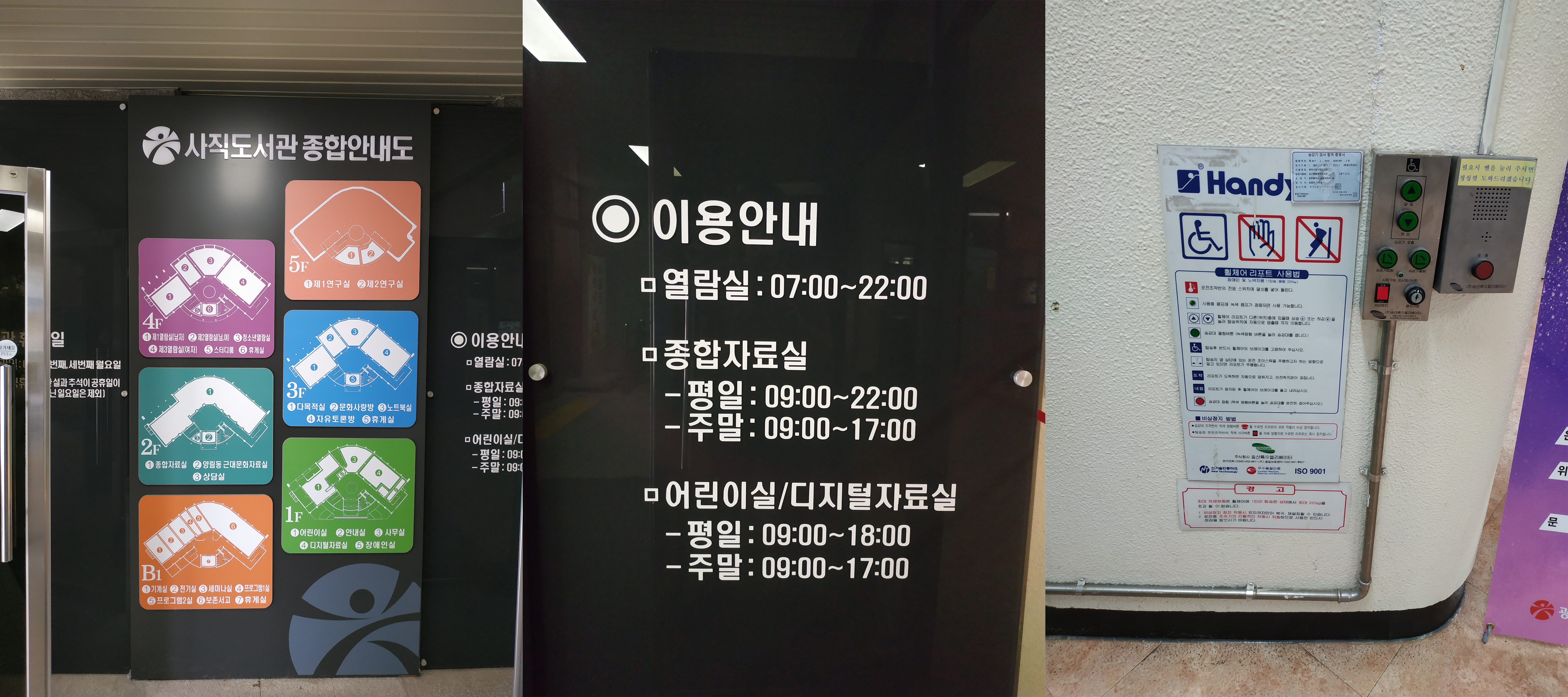왼쪽 사진부터, 안내도, 이용시간이고요, 매달 첫째 주 셋째 주 월요일은 휴일입니다.