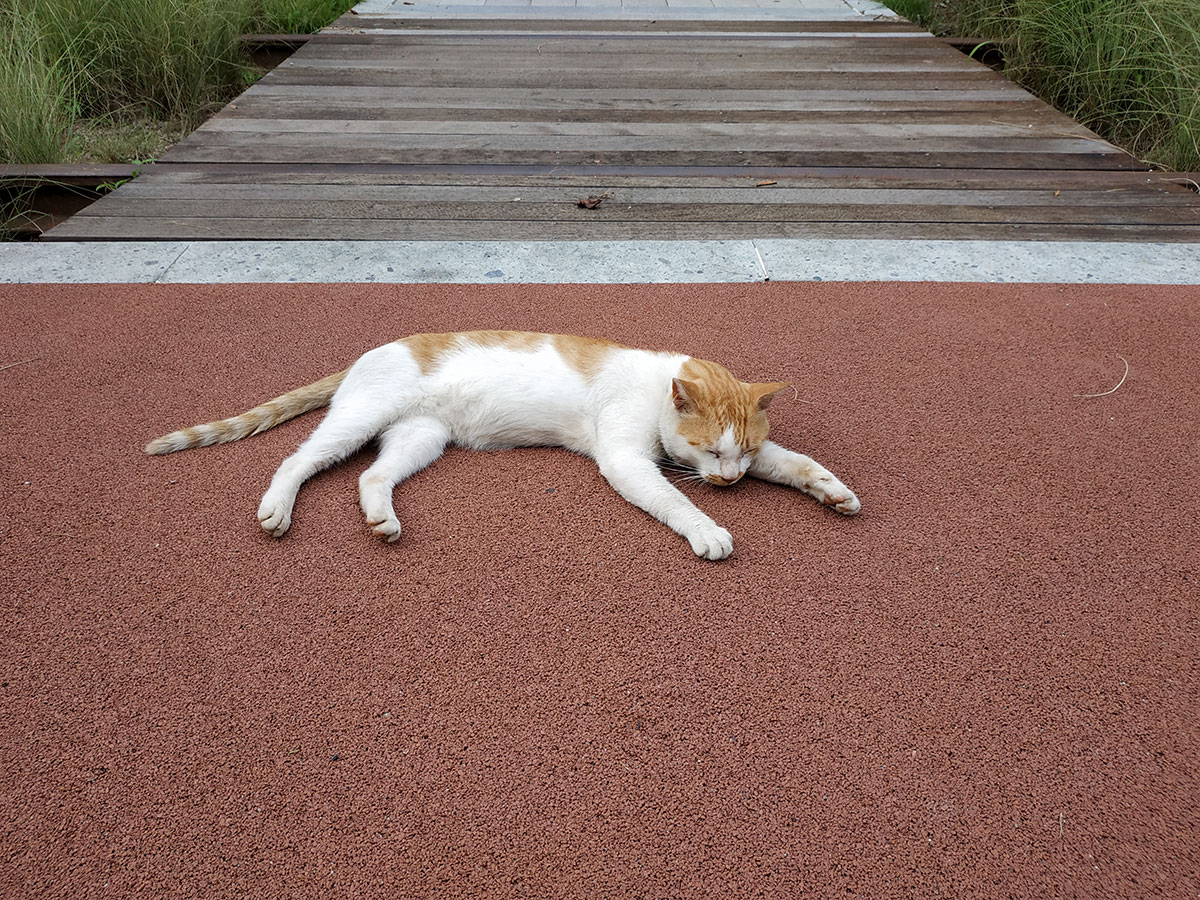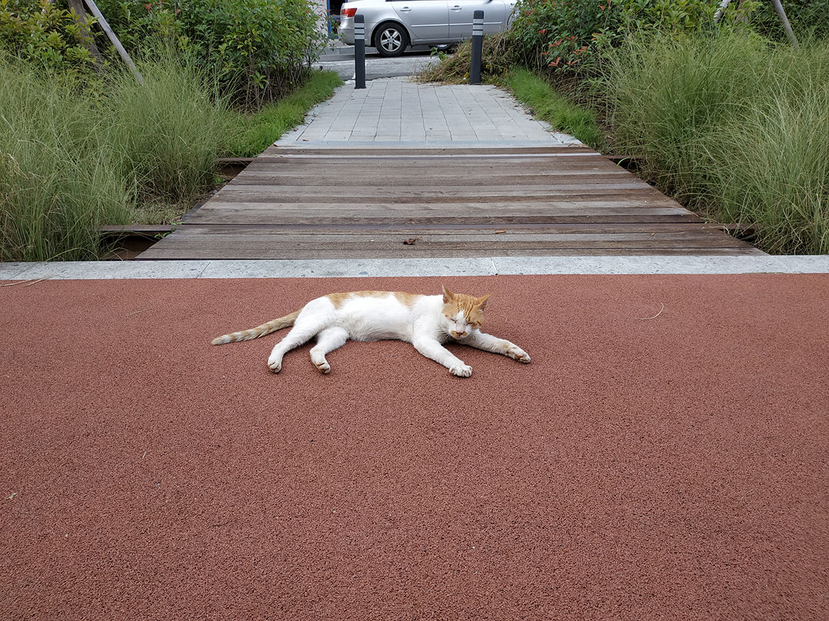 지나다니는 사람들 굉장히 많은 이 공원에 고양이가 누워있었습니다.