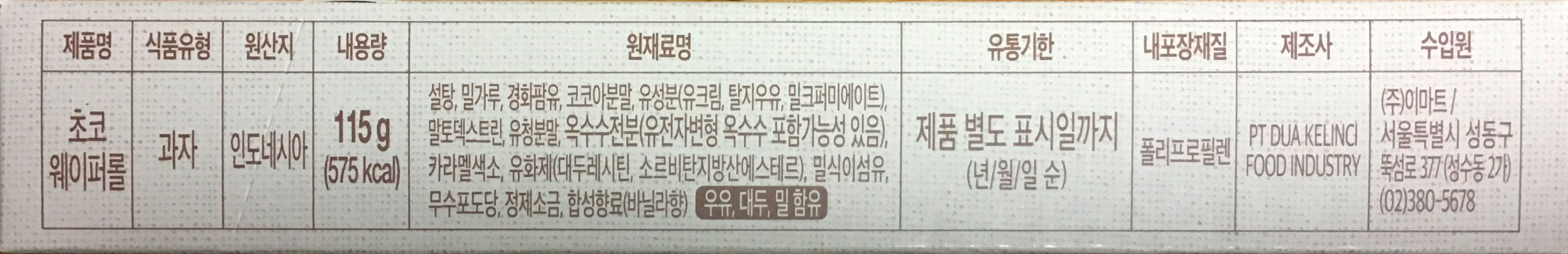 노브랜드 초코 웨이퍼롤의 원재료명, 영양정보
