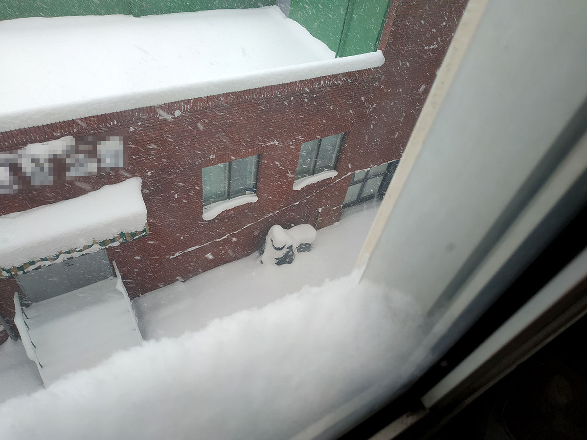 창밖으로 보이는 빨간 벽돌의 건물 옆에 놓여있는 무언가에 눈이 쌓여있는 게 보이실 겁니다.