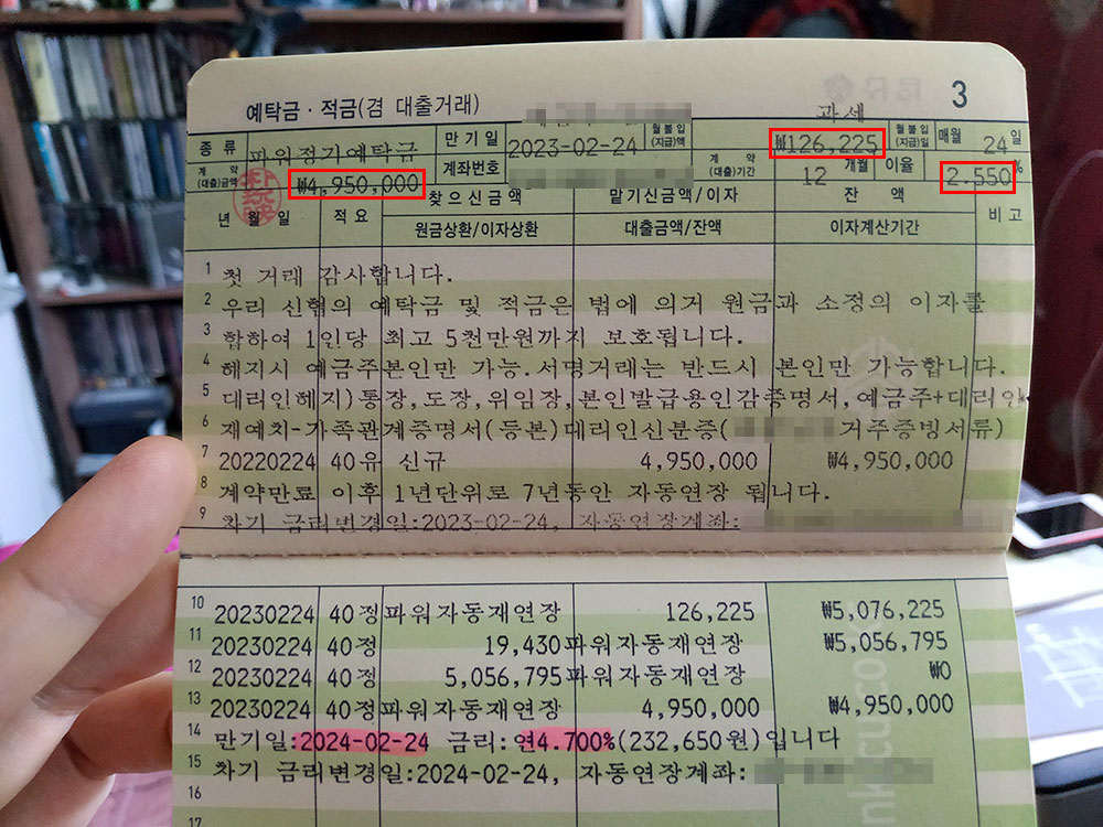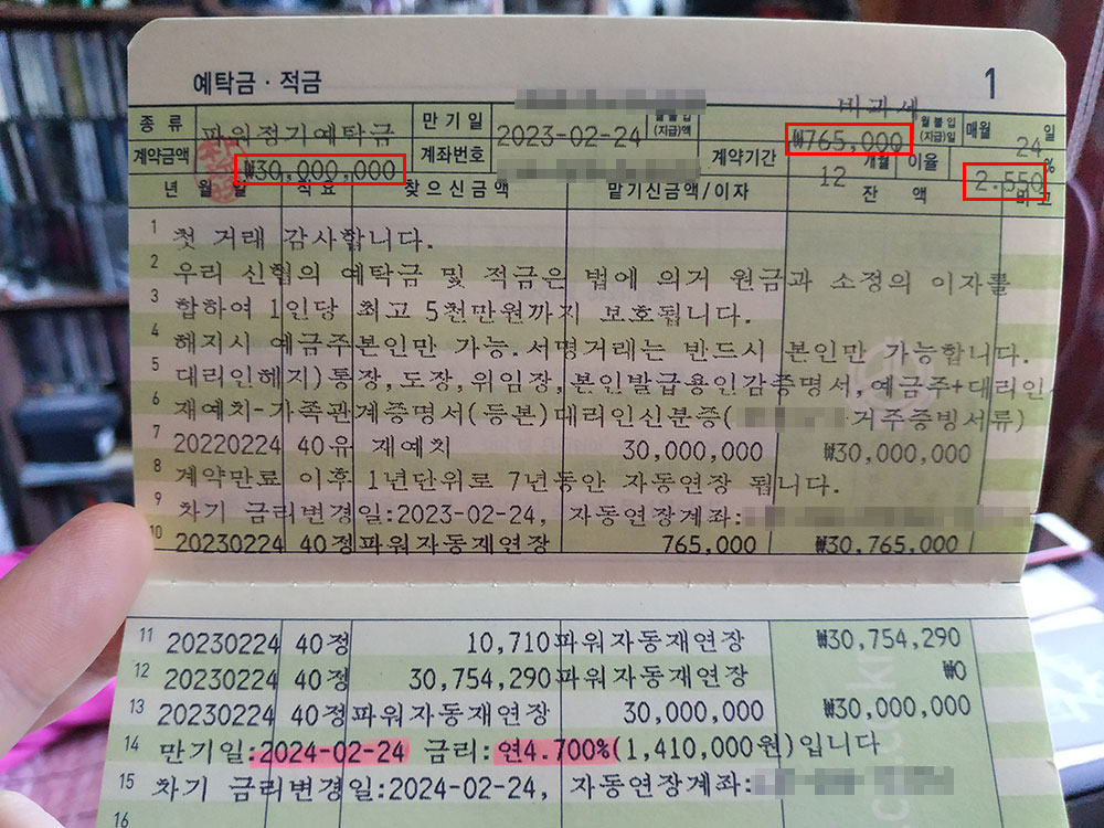 입금해 둔 금액과 당시의 이율, 그리고 만기 후에 받게 될 이자를 빨갛게 표시해 두었습니다.